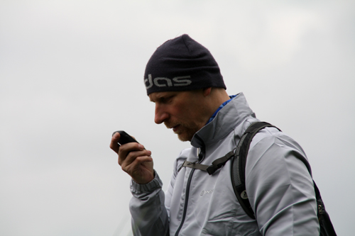 typische Pose, der Blick auf sein "Garming"-Navigationssystem: